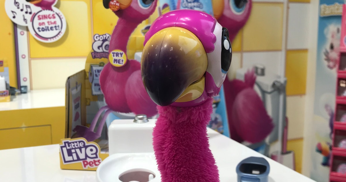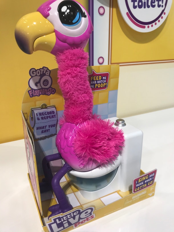 Because every kid needs a toy that poops – thanks, Target!. Moose Little Live Pets Gotta Go Flamingo. Sherbet is a fluffy, bright pink flamingo with a hard, yellow beak and wobbly purple legs (probably from sitting on the throne for too long!) The Little Live Pets Gotta Go Flamingo is hilarious and will repeat whatever they say in its silly voice.