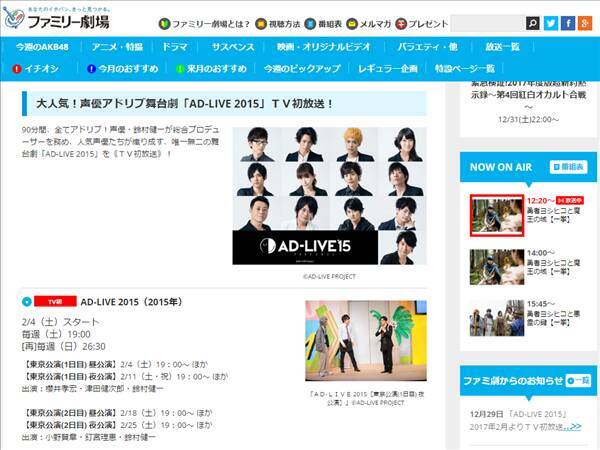 総合p 鈴村健一によるミニ解説付き 声優アドリブ舞台劇 Ad Live 15 ファミリー劇場で2 4 土 放送開始 毎週 土 19 00 再放送 毎週 日 26 30 アニメ系情報 あにまっぷニュース